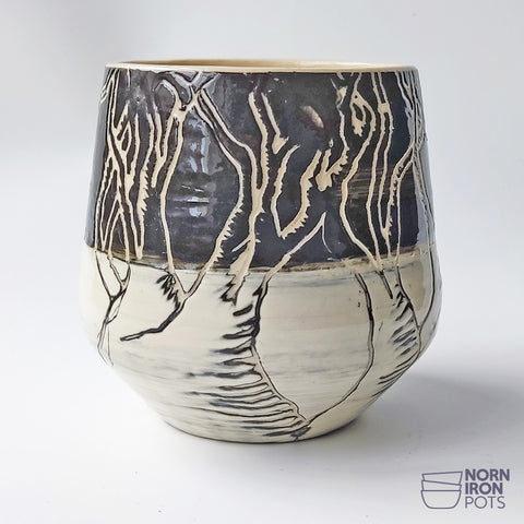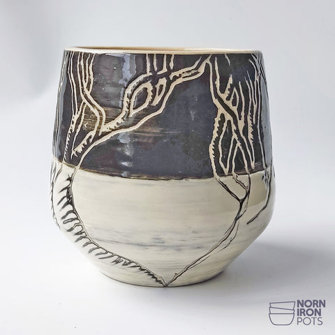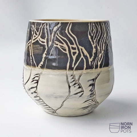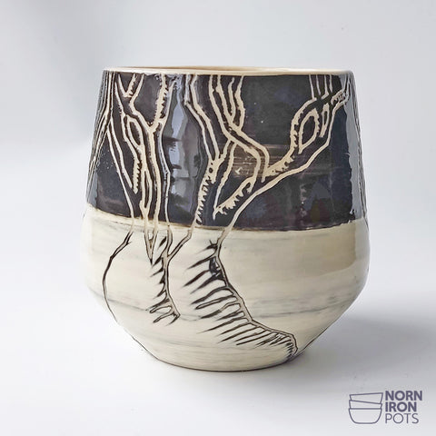 Hand-carved using the 'Sgraffito' technique, black and white slip are carefully layered and then scratched away to reveal twisting tree forms – no two are the same. Every piece takes ages to carve (so yes, the price reflects that level of graft and love).