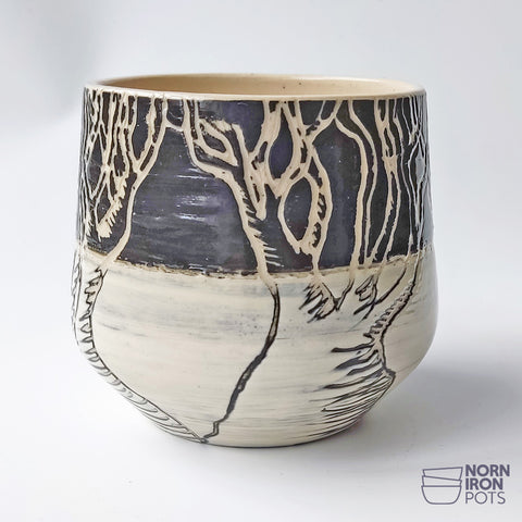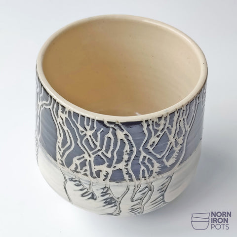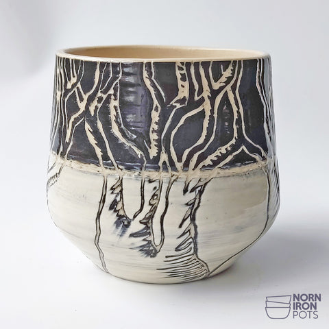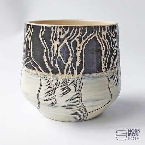 Hand-carved using the 'Sgraffito' technique, black and white slip are carefully layered and then scratched away to reveal twisting tree forms – no two are the same. Every piece takes ages to carve (so yes, the price reflects that level of graft and love).